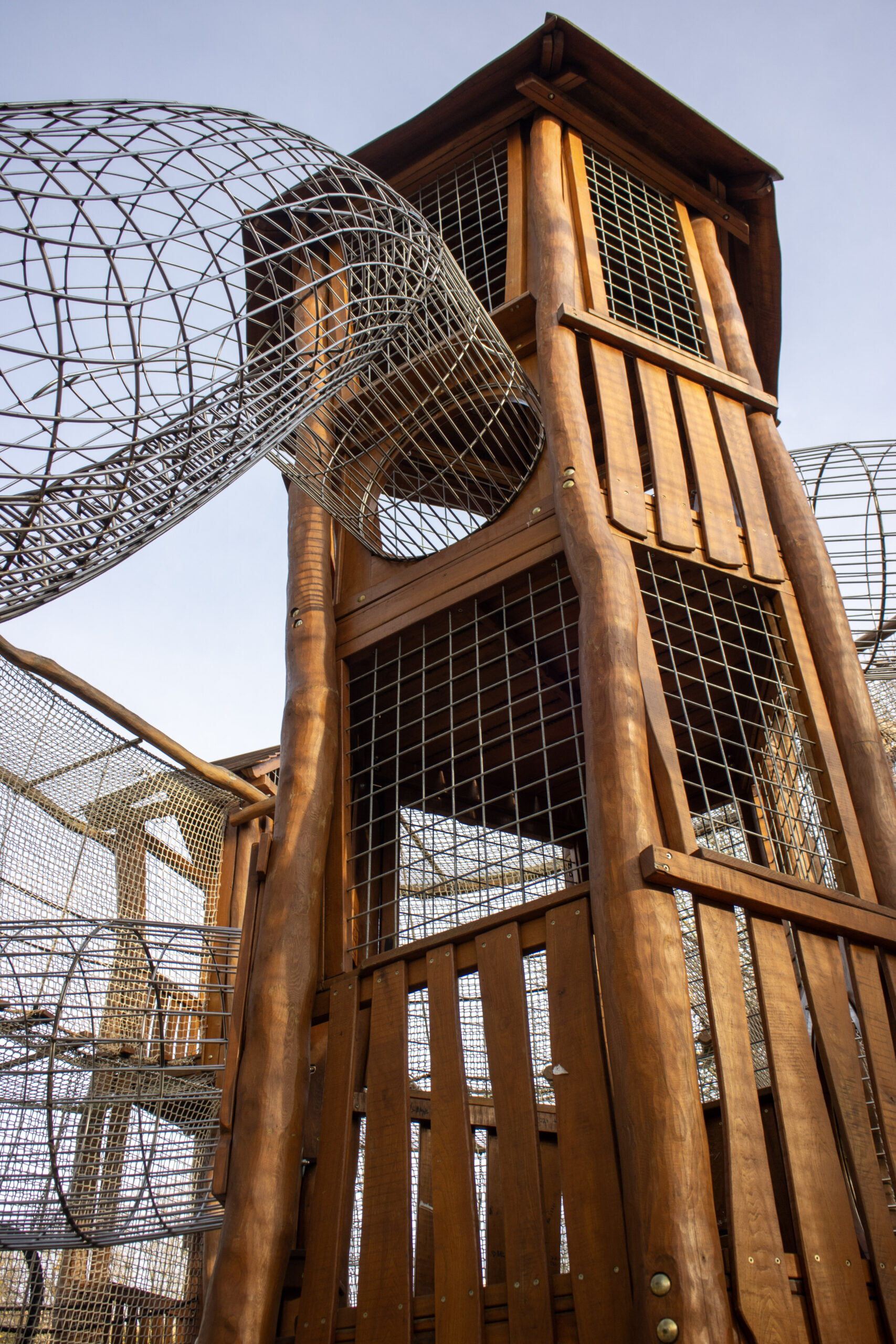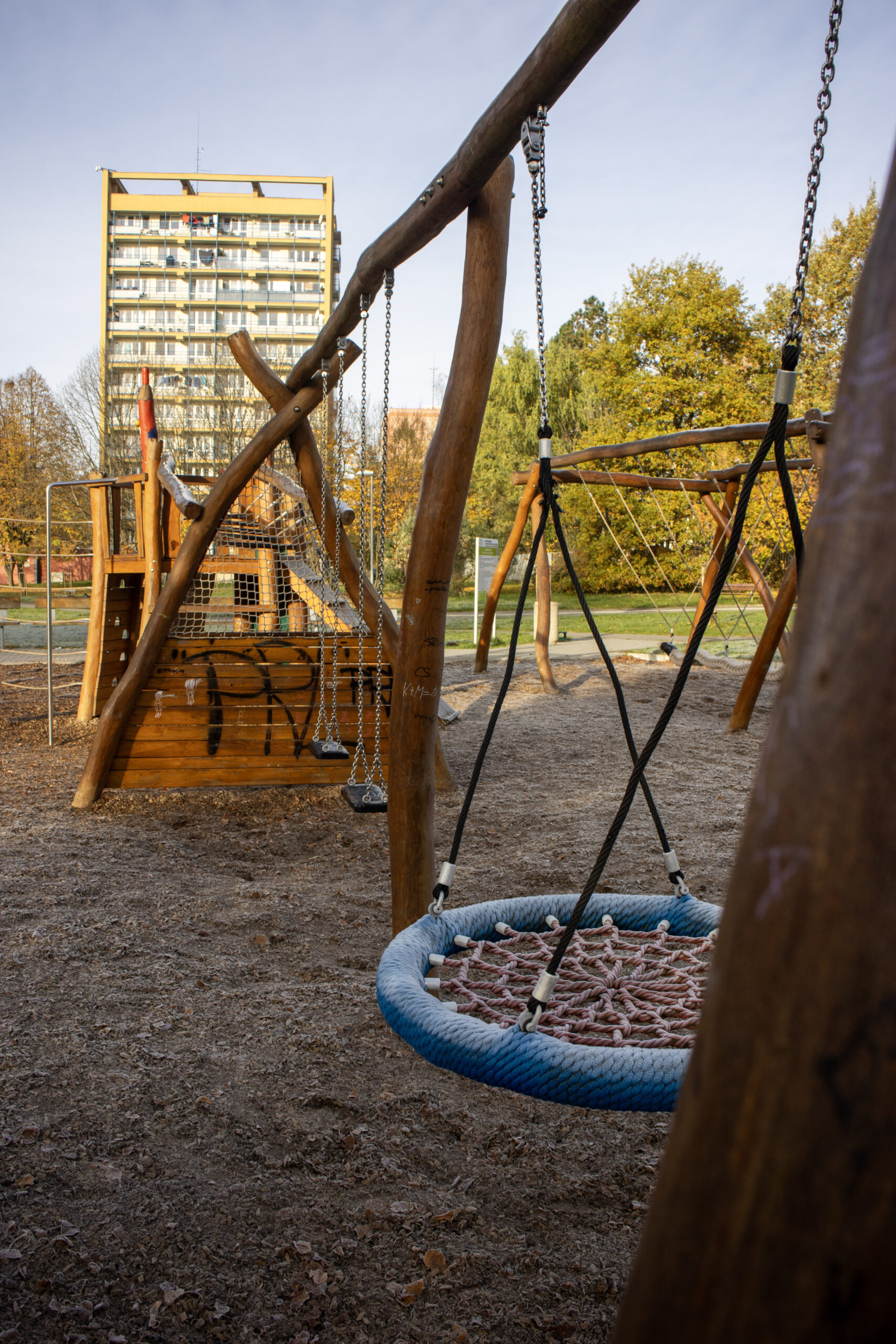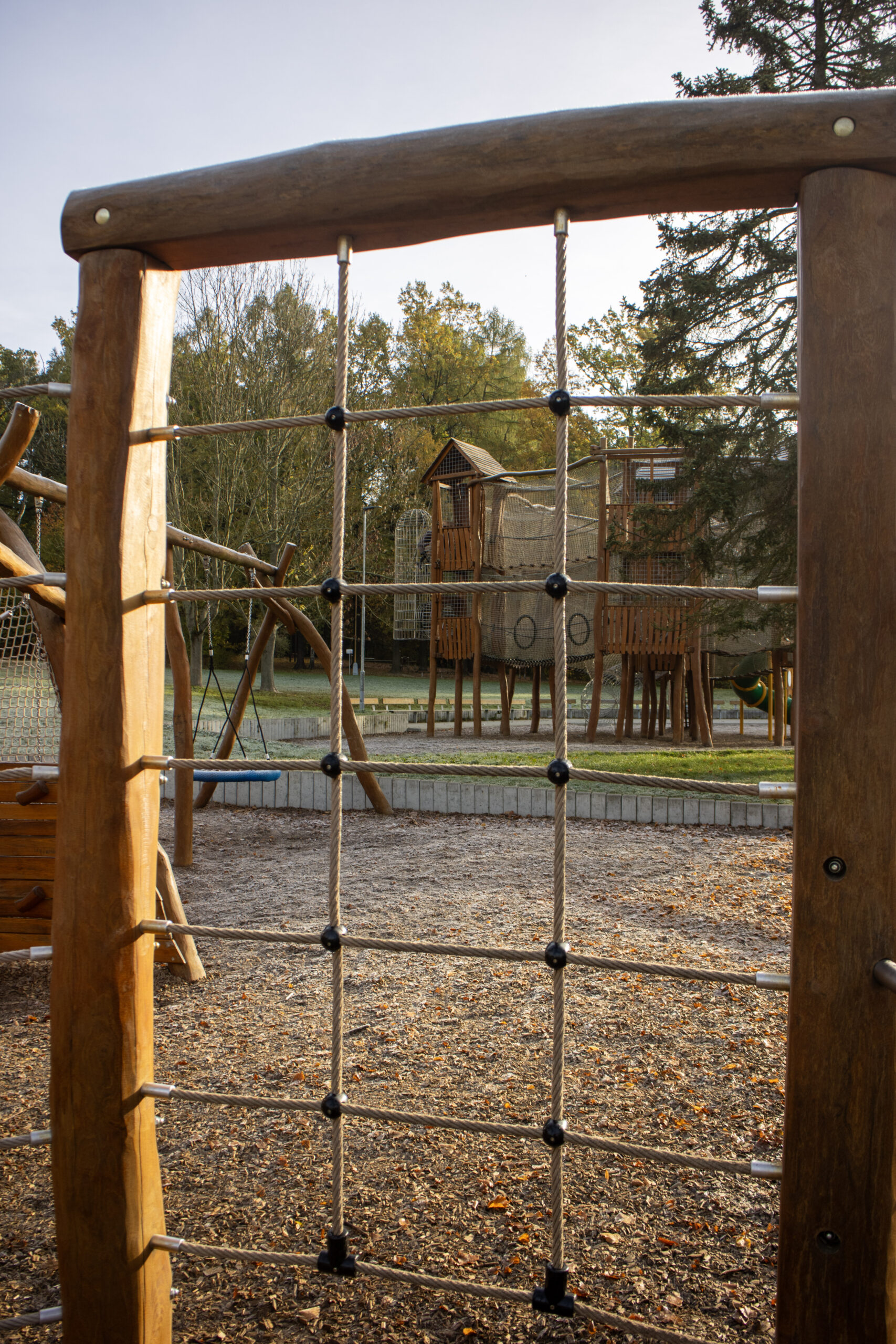 Dalším prvkem je lanová prolézací pyramida, která představuje výzvu pro malé horolezce. Děti zde mohou zdolávat různé výšky a posilovat svou sílu i jemnou motoriku. Hřiště také nabízí velkou dvoupatrovou prolézačku, která zahrnuje skluzavky, překážky a prolézací tunely. Tento komplexní prvek podporuje rozvoj obratnosti a představivosti, každý kout skrývá nové dobrodružství a podněcuje dětskou kreativitu. K dispozici je i zóna s houpačkami, skluzavkou, bradly a ručkováním, které umožňují rozvoj motorických dovedností, síly a koordinace pohybů. Pro nejmenší návštěvníky je tu bezpečné pískoviště s interaktivními prvky, které podporují kreativitu a jemnou motoriku při stavění různých tvarů. Posledním prvkem je kopeček s tunelem a tyčovou skluzavkou, který nabízí možnost prolézání, klouzání a objevování různých způsobů, jak překonat terénní překážky.