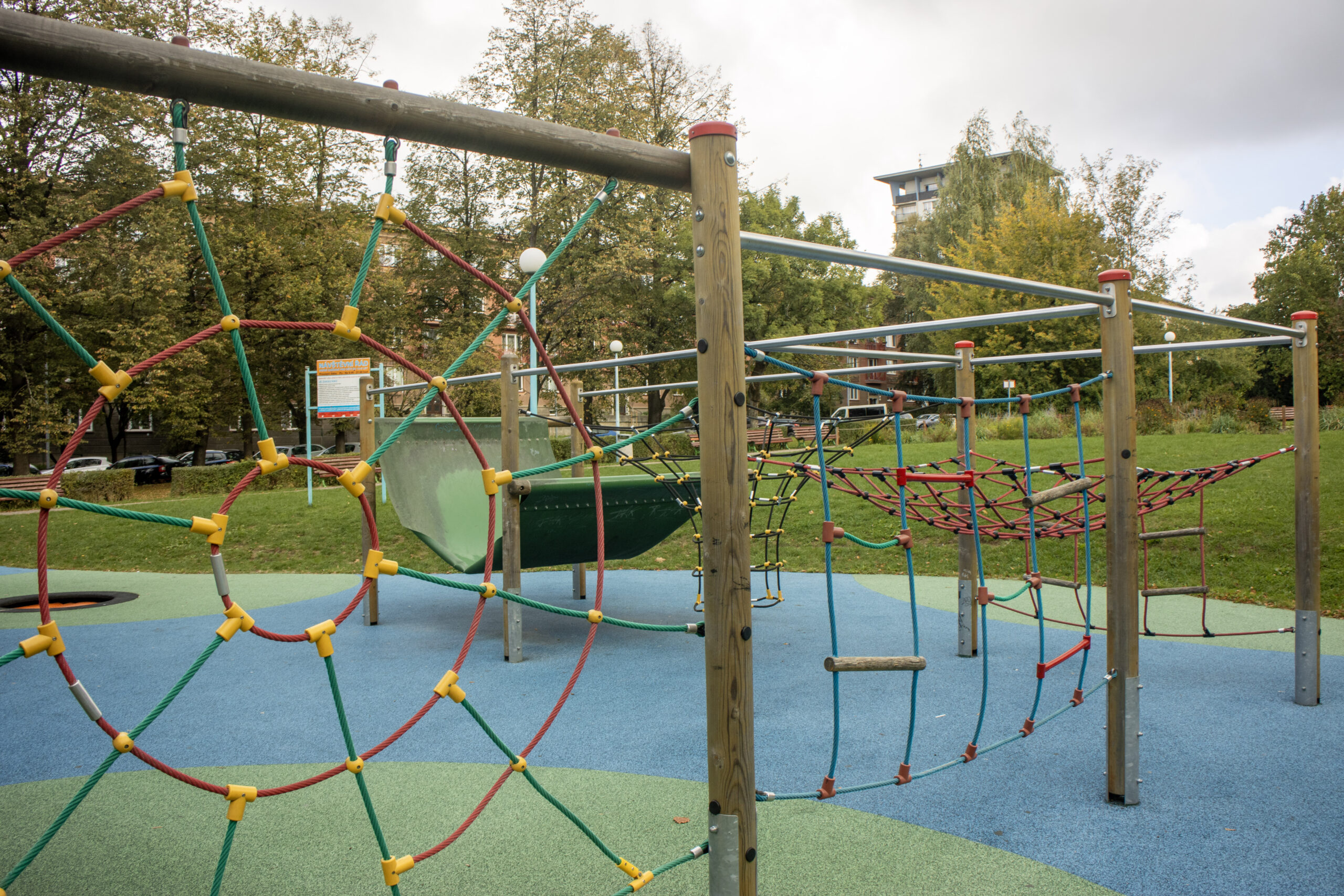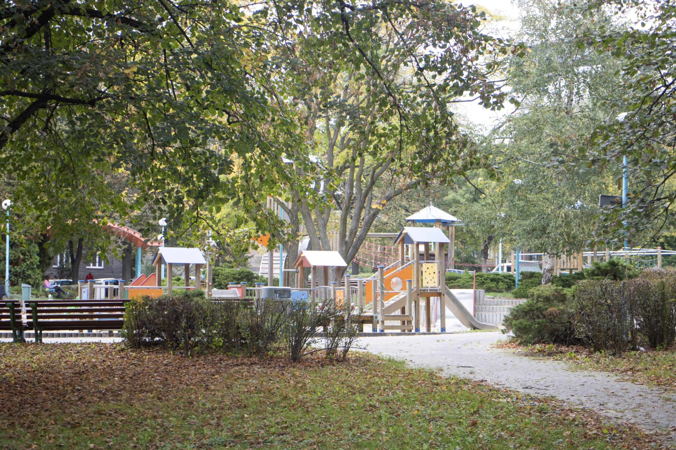 Druhé hřiště je ideální pro mladší děti, nabízí houpačky, kolotoč, menší skluzavky a velké množství prolézaček. Plocha je pokryta jemným pískem, který pomáhá v rozvoji jemné motoriky a zároveň tvoří příjemný měkký povrch. Obě hřiště jsou bezpečně oddělena, aby se zajistila maximální ochrana dětí. Celé prostředí parku je navrženo tak, aby se děti mohly svobodně a bezpečně bavit. Po obvodu obou hřišť se rovněž nachází velké množství laviček a díky stromům se zde v létě tvoří příjemný stín.