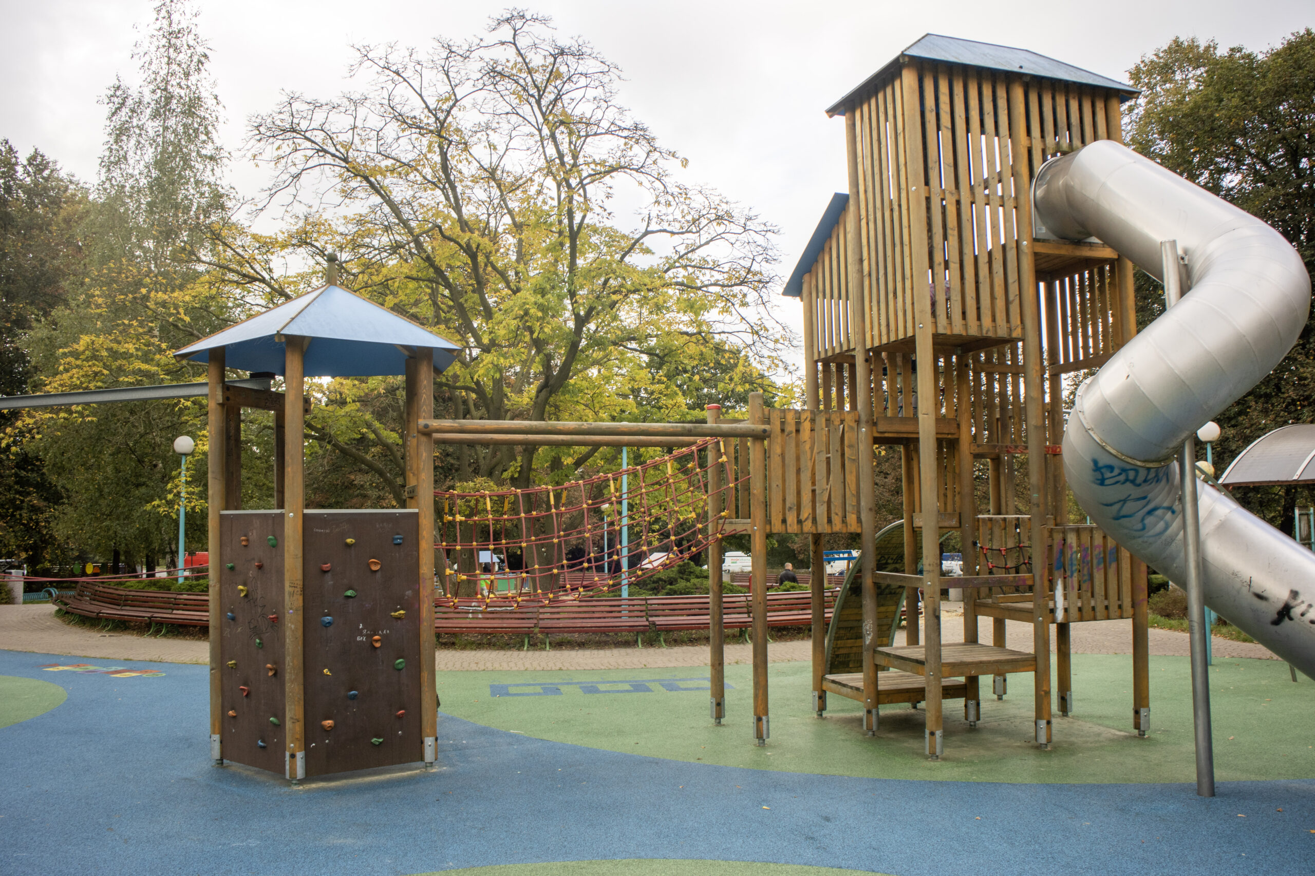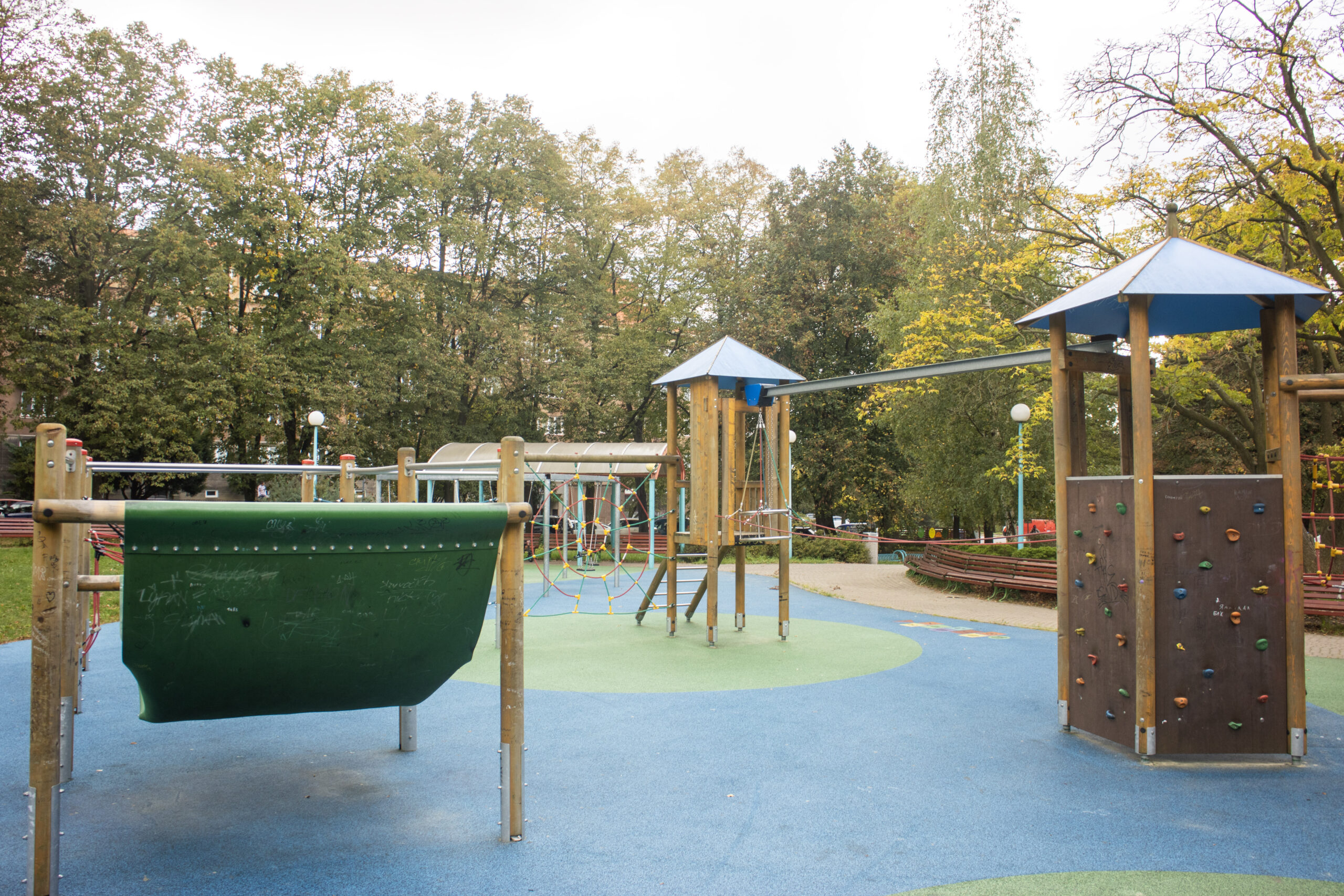 Dětský park nabízí dvě oddělená dětská hřiště. První hřiště je určeno spíše pro starší děti, které se nebojí výšek. Hlavními atrakcemi jsou například dlouhá točená skluzavka, houpačky, ručkovací dráha, trampolíny, nebo lanové prolézačky. Všechny tyto prvky podporují fyzickou zdatnost, rovnováhu a koordinaci pohybu. Celá tato část je pokryta gumovým povrchem, který tlumí případné pády.