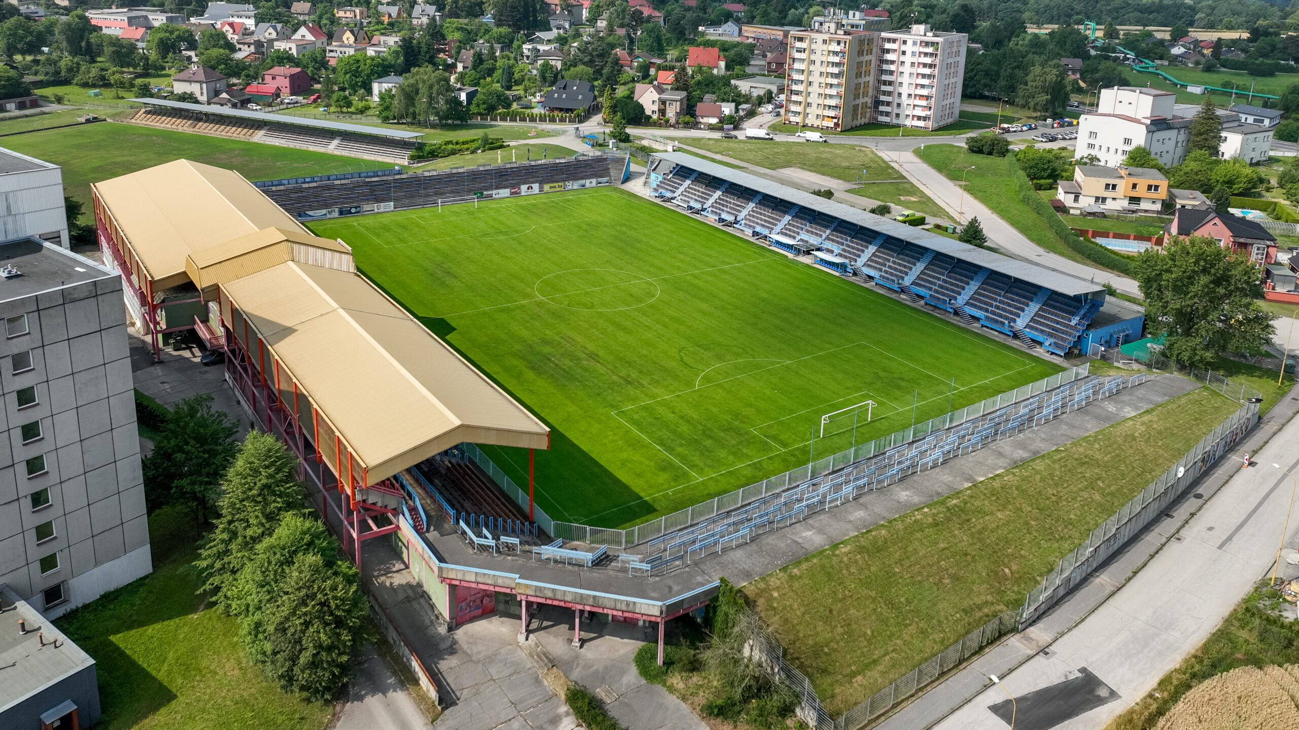 Velký fotbalový areál je vybaven třemi hřišti, která poskytují ideální podmínky pro fotbalová utkání a tréninky. Dvě z nich mají travnatý povrch, ideální pro pořádání zápasů i intenzivní trénink. Třetí hřiště je s umělým trávníkem, což zaručuje celoroční využití a odolnost vůči nepříznivému počasí. K oběma hřištím s přírodním trávníkem je připojena tribuna, která nabízí pohodlné sezení pro diváky a podporuje skvělou atmosféru při každém utkání.